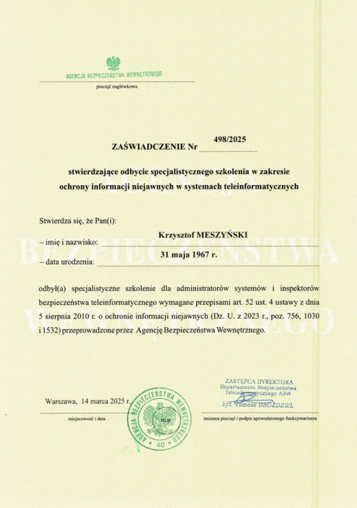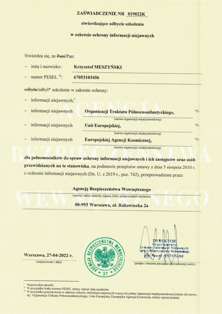 Współpracujemy z doświadczonymi specjalistami posiadającymi poświadczenia bezpieczeństwa do klauzuli „TAJNE” (NATO SECRET / EU SECRET). Każdy projekt powierzany naszej firmie to gwarancja najwyższego poziomu merytorycznego i operacyjnego.