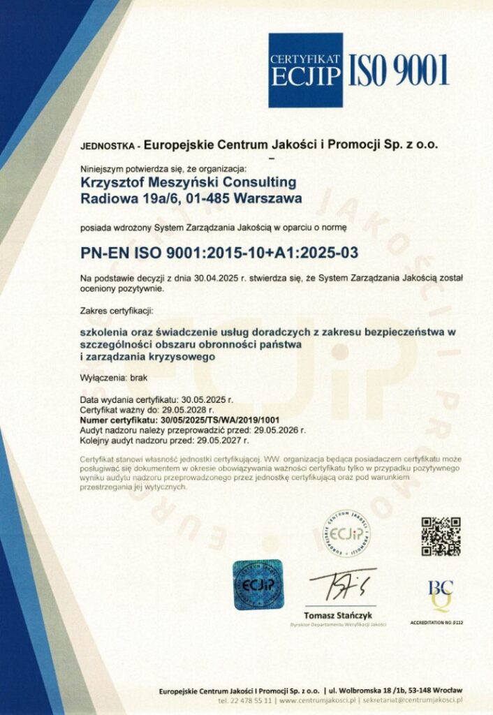 Nasze procesy są zgodne z normą PN-EN ISO 9001:2015, a zakres certyfikacji obejmuje zarówno szkolenia, jak i doradztwo w obszarach obronności i zarządzania kryzysowego.